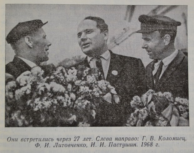 Члены экипажа танка Т-34 №03 Федор Литовченко (мехвод), Григорий Коломиец (заряжающий), Иван Пастушин (стрелок радист) прошли с танком всю войну, встречались впоследствии на местах сражений, в том числе и в памятном городе Калинине-Твери.