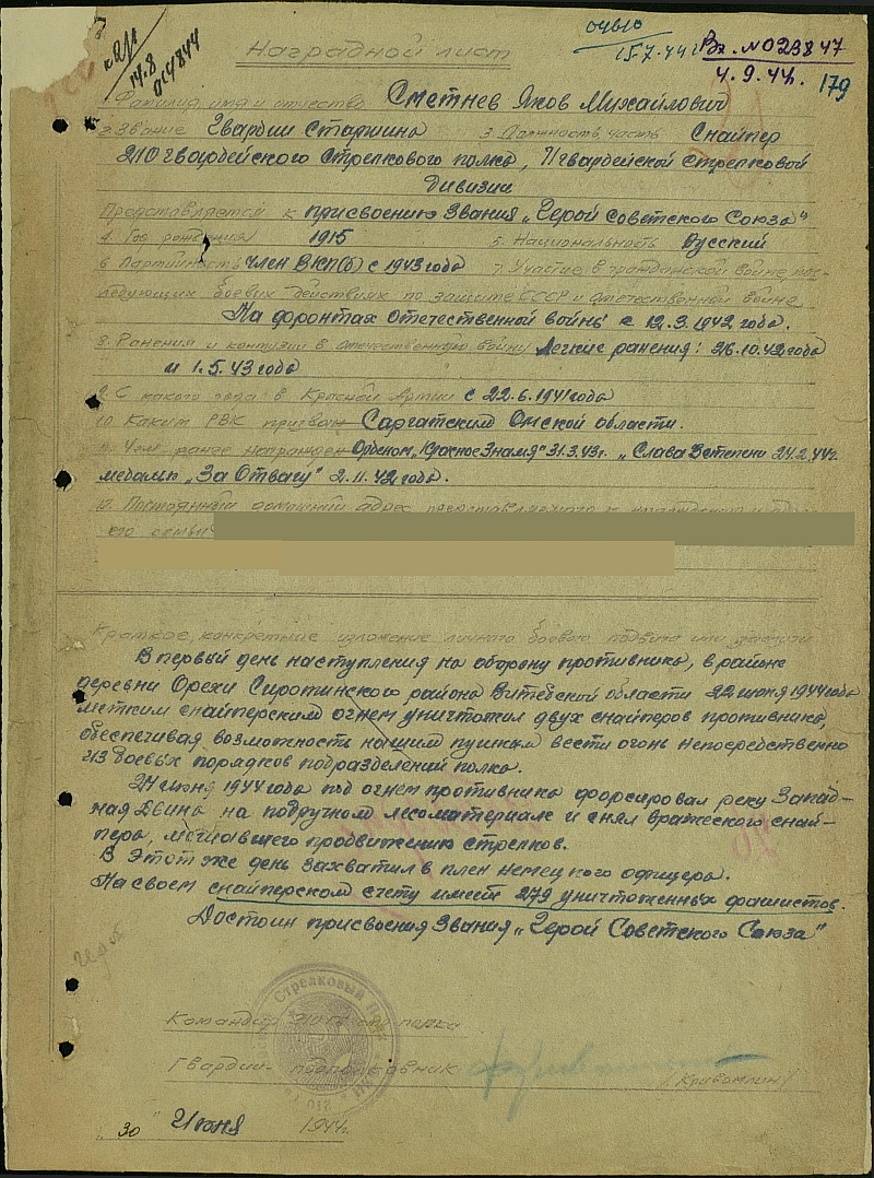 279 уничтоженных солдат и офицеров противника - таков боевой счёт снайпера Гвардии старшины Я. М. Сметнёва к июлю 1944 года. Указом Президиума Верховного Совета СССР от 24 марта 1945 года удостоен звания Героя Советского Союза с вручением ордена Ленина и медали "Золотая Звезда". Окончательный итог его снайперской деятельности - неизвестен.