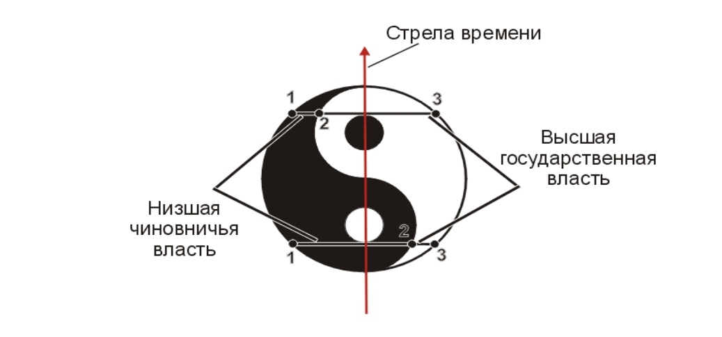 Нижняя часть монады описывает слабое государство, но эволюция любого государства такова, что со временем (центральная ось символа – стрела времени) теневая часть экономики неизбежно будет вытесняться на «свет» легальной экономики. В сильном государстве решения принимаются высшей властью на государственном уровне, в коррупционном государстве уровень принятия решений иной – высшая власть там тоже принимает решения, но они не доходят до низших слоев. В таком государстве фактически уровень принятия решения осуществляется на низшем чиновничьем уровне (рис 2, нижняя часть монады). В этом смысле коррупцию можно охарактеризовать как процесс ослабления высшей государственной власти в пользу власти низшей, что всегда сопровождается частичной или полной потерей государственности.