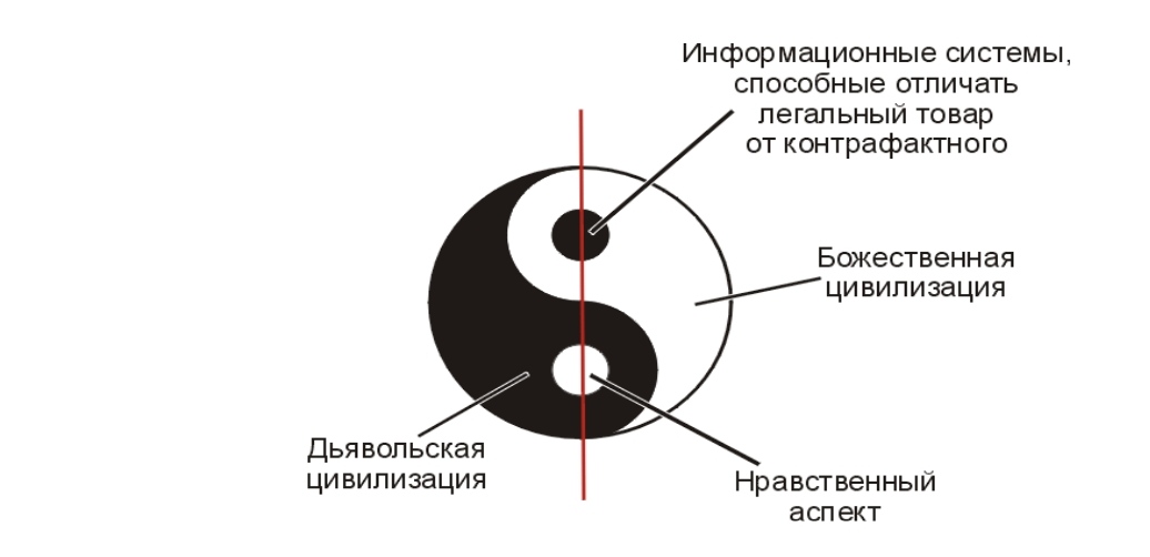 Относительная (но не окончательная) победа добра над злом (победа божественной цивилизации над дьявольской) не достигается только за счет информационных технологий [8], такая победа возможна только через формирование духовного белого «островка» на символе мироздания, который условно можно назвать нравственным аспектом.