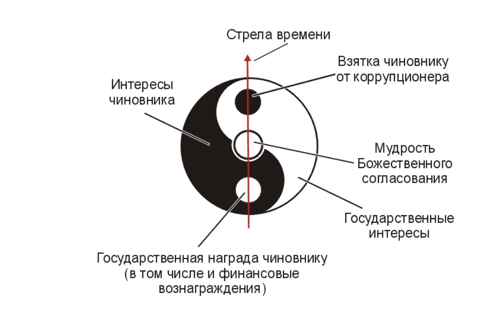 Можно ли победить непобедимого чиновника и коррупцию? Символ мироздания подтверждает, что на любом историческом отрезке времени коррупция как явление будет существовать всегда, наша задача сводится только к минимизации проявлений этой болезни власти и общества [7]. Нельзя строить государственную экономическую структуру на корпоративно-мафиозной круговой поруке, а политику – только на животных (дарвинистских) интересах отдельных чиновников.