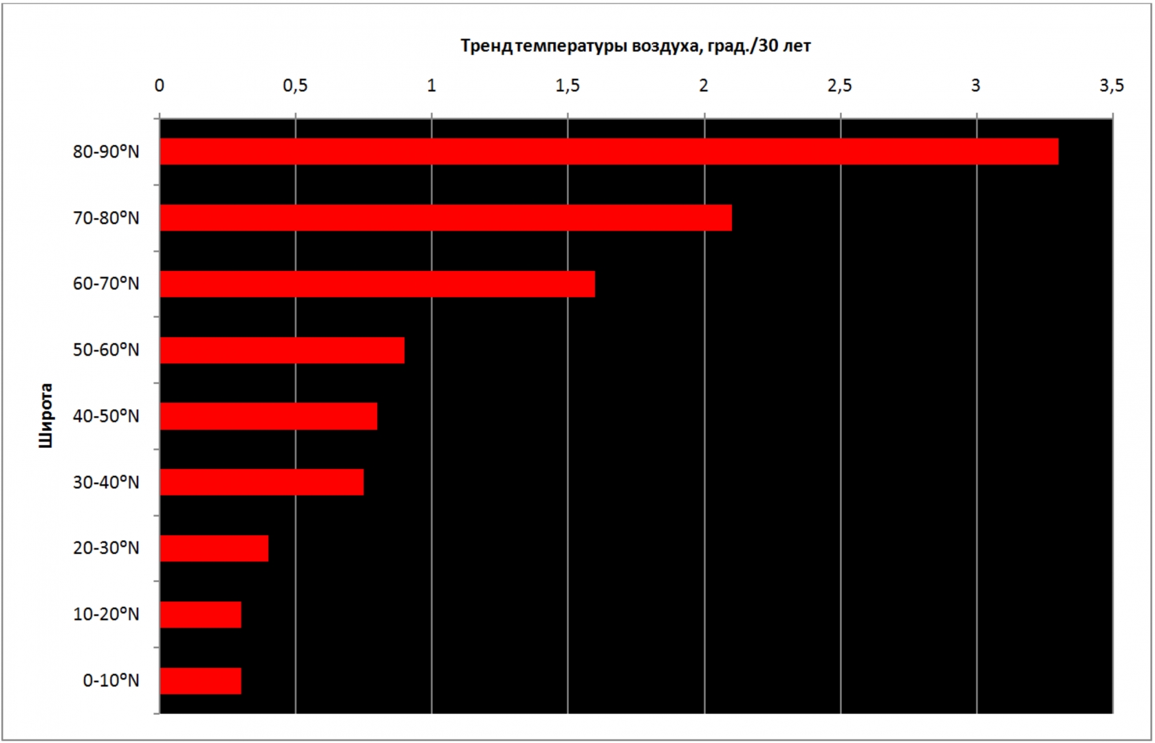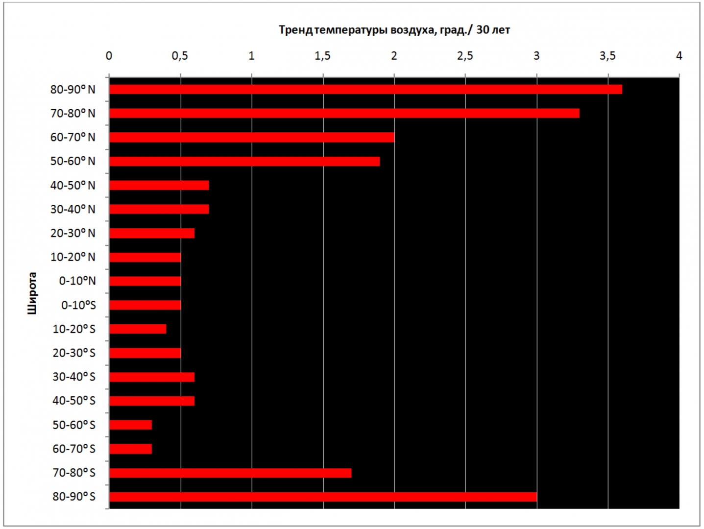 Рис. 1. Линейные тренды средней годовой температуры воздуха в период 1990–2019 гг. по широтам земного шара
