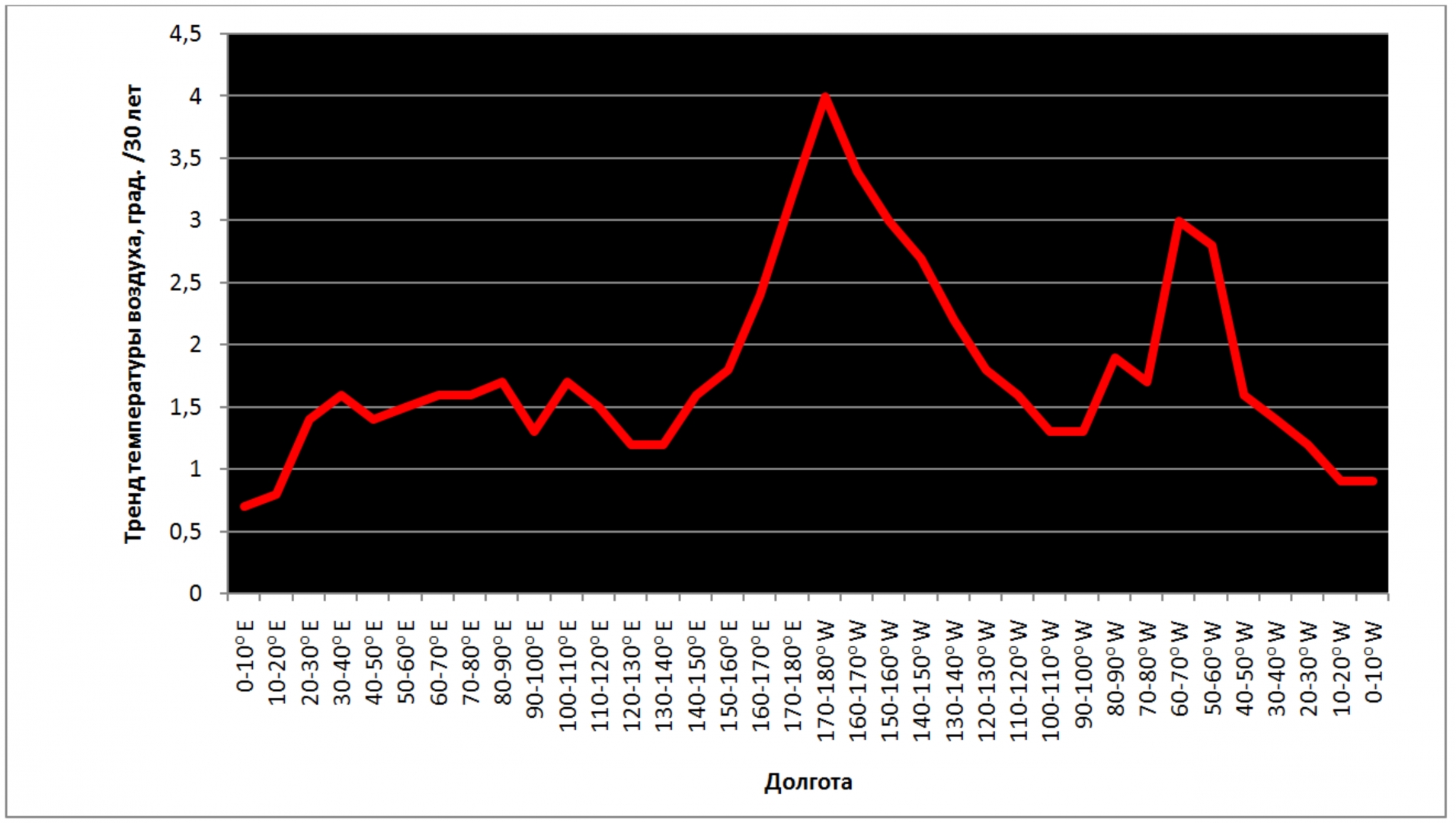 Нельзя исключать, что интересующий нас сигнал может проявиться при сопоставлении трендов температуры по меридианам, поскольку в атмосфере к северу от тропика Рака господствует западный перенос. Но следов адвекции тепла из мест проживания основной массы населения земного шара найти не удается. Вместо этого обнаруживается удивительный феномен аномального прогревания воздуха в районе Берингова пролива, а также максимум в Атлантическом океане при отсутствии реакции атмосферы на эмиссию парниковых газов в Европе и Северной Америке (Рис. 4).