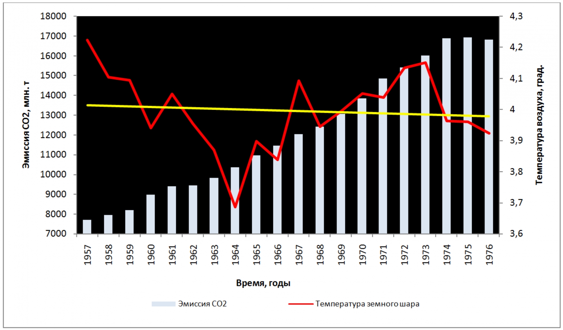 Рис. 8. Рост антропогенной эмиссии СО2 и тенденция к снижению средней годовой температуры воздуха у поверхности земного шара в период 1957–1976 гг. Показан линейный тренд температуры