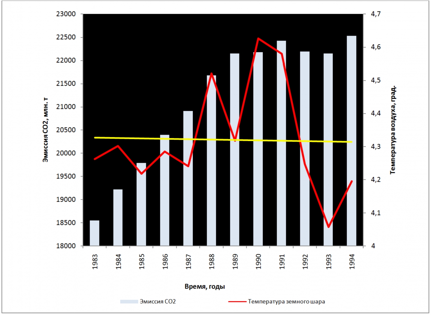 Рис. 9. Антропогенная эмиссия СО2 и средняя годовая температура воздуха у поверхности земного шара в период 1983–1994 гг. Показан линейный тренд температуры