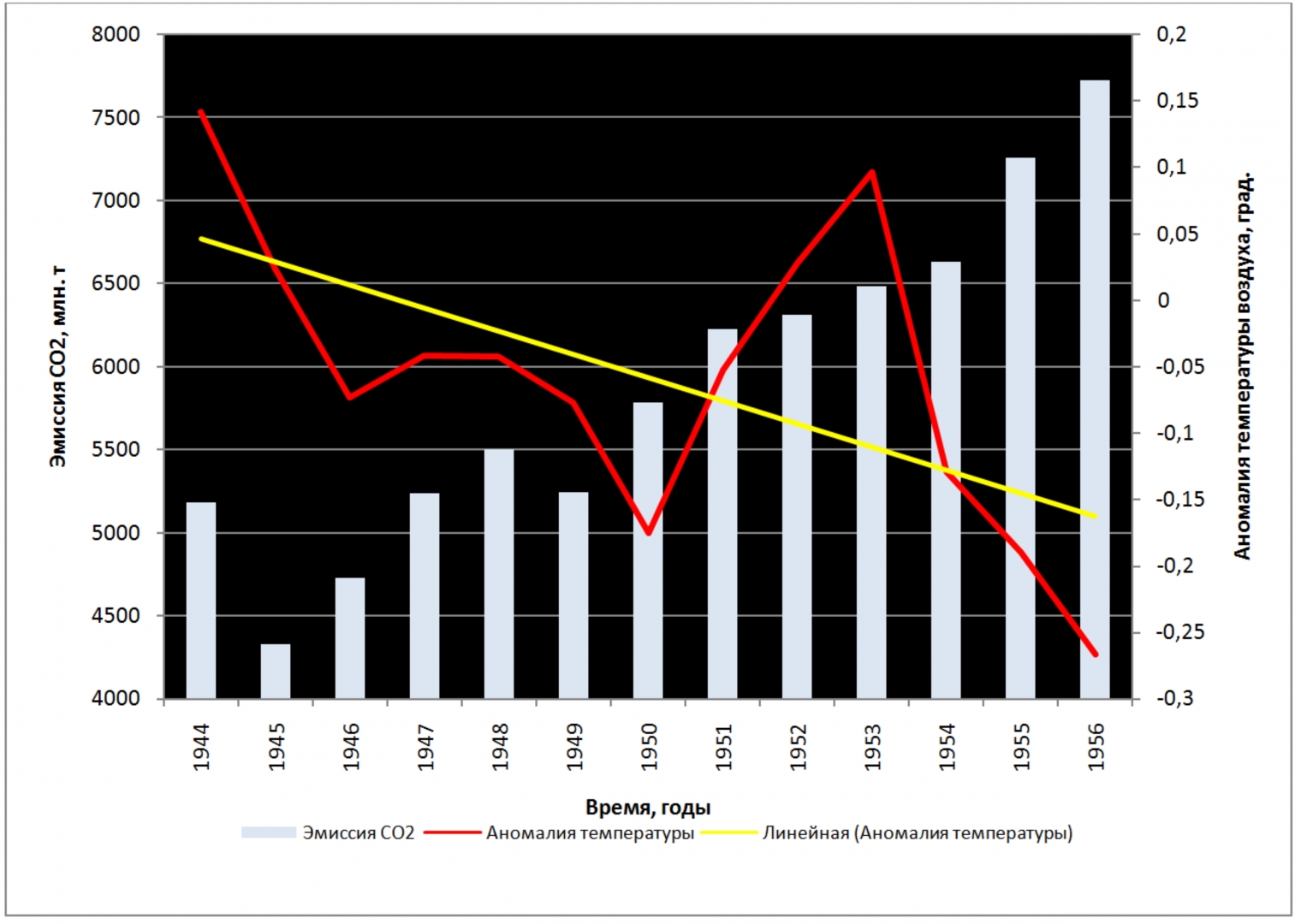 Рис. 7. Антропогенная эмиссия СО2 и глобальная аномалия температуры воздуха в период 1944–1956 гг. Показан линейный тренд аномалии
