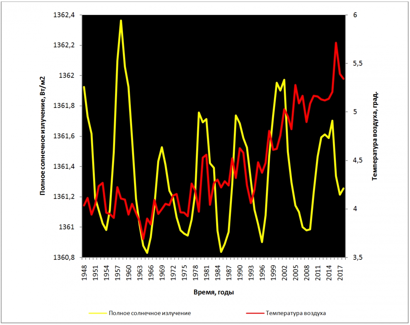 Рис. 10. Полное солнечное излучение и средняя годовая температура воздуха у поверхности земного шара в период 1948–2018 гг