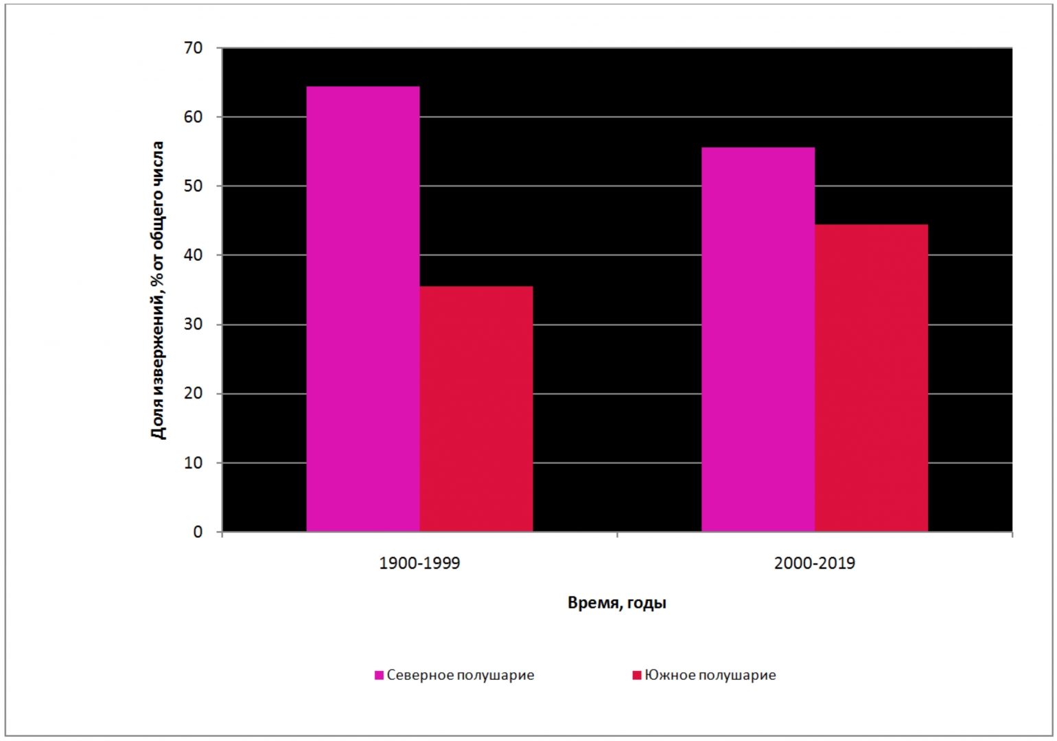 Рис. 15. Соотношение начавшихся извержений с выбросами более 10 тыс. куб. м в Северном и Южном полушариях