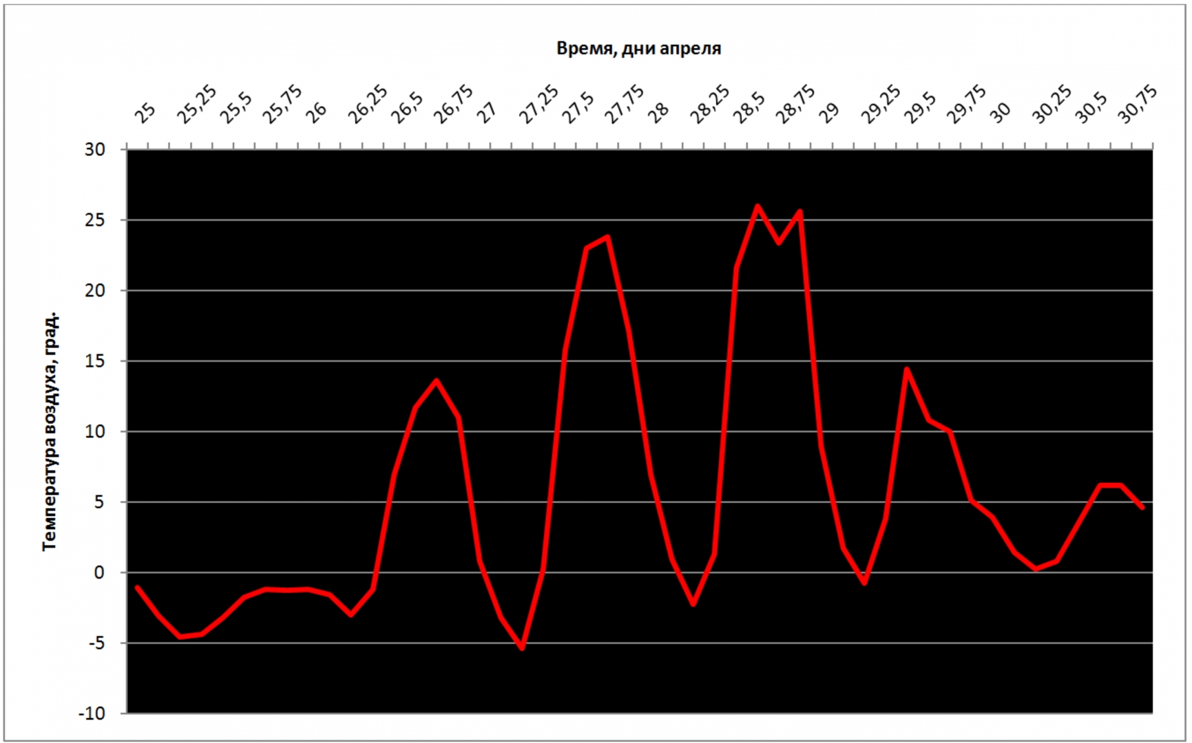 Рис. 16. Температура воздуха 25–30 апреля 2014 г. в городе Петровск-Забайкальский