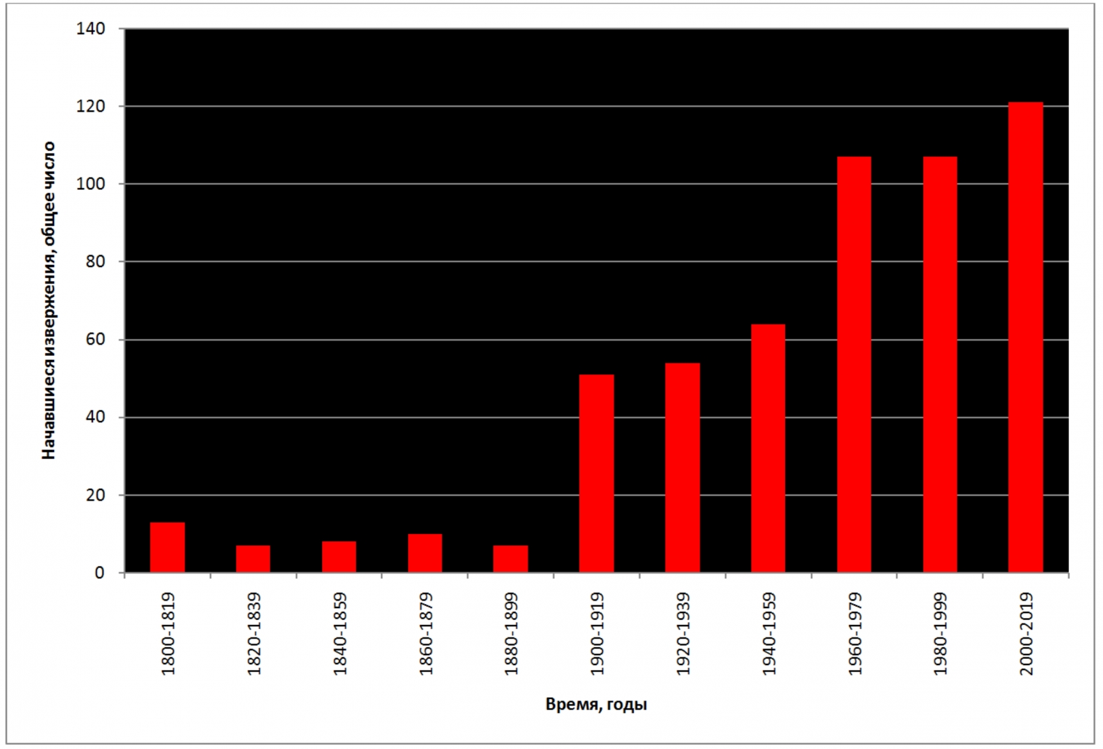 Рис. 14. Динамика общего количества начавшихся вулканических извержений за 20-летние периоды в 1800–2019 гг. (выборка включает события, при которых объем выброшенной массы превышал 10 тыс. куб. м)