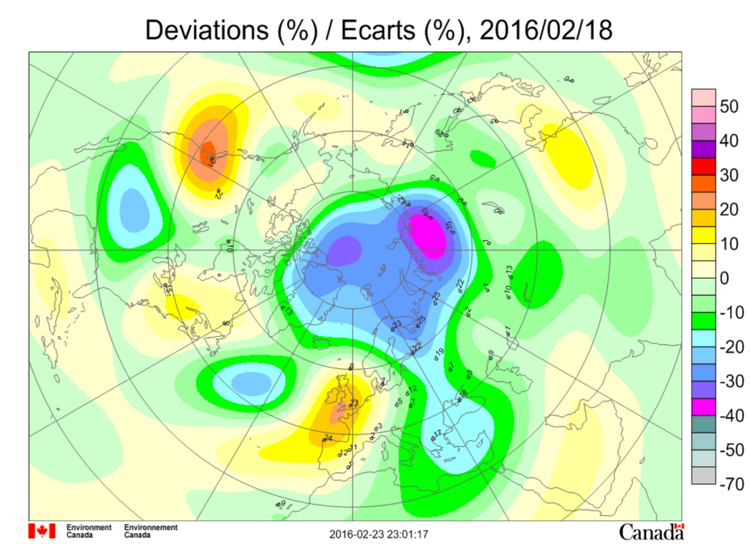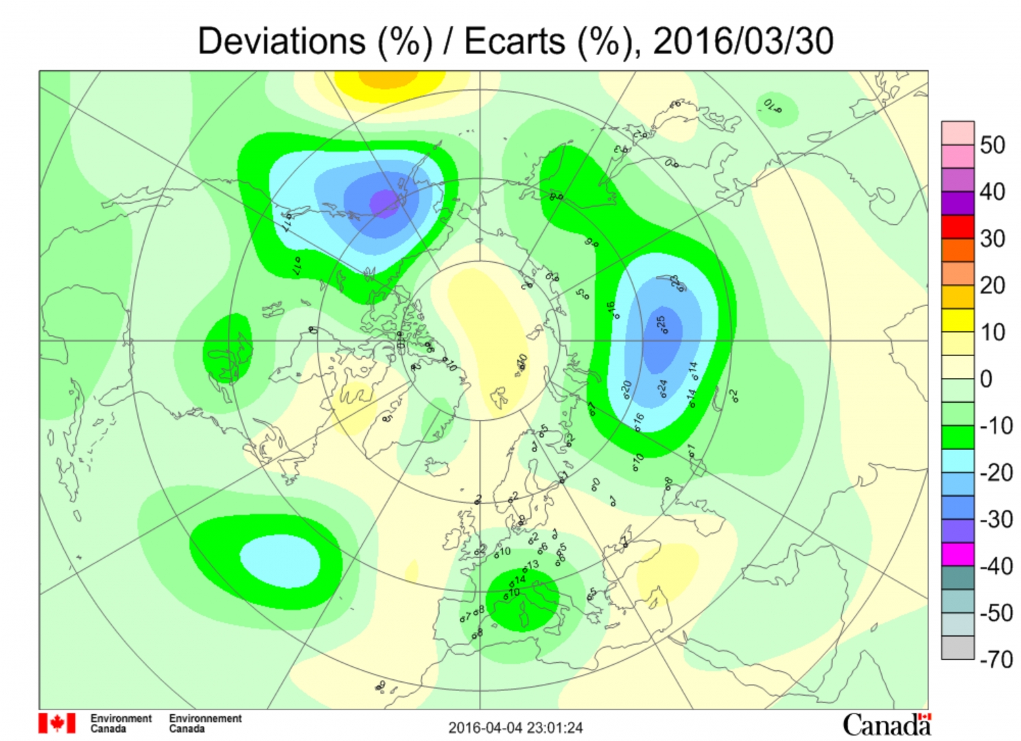 Рис. 25. Аномалия общего содержания озона 30 марта 2016 г. к востоку от Алеутской дуги. Температура воздуха на острове Адак в этот день была максимальной за месяц