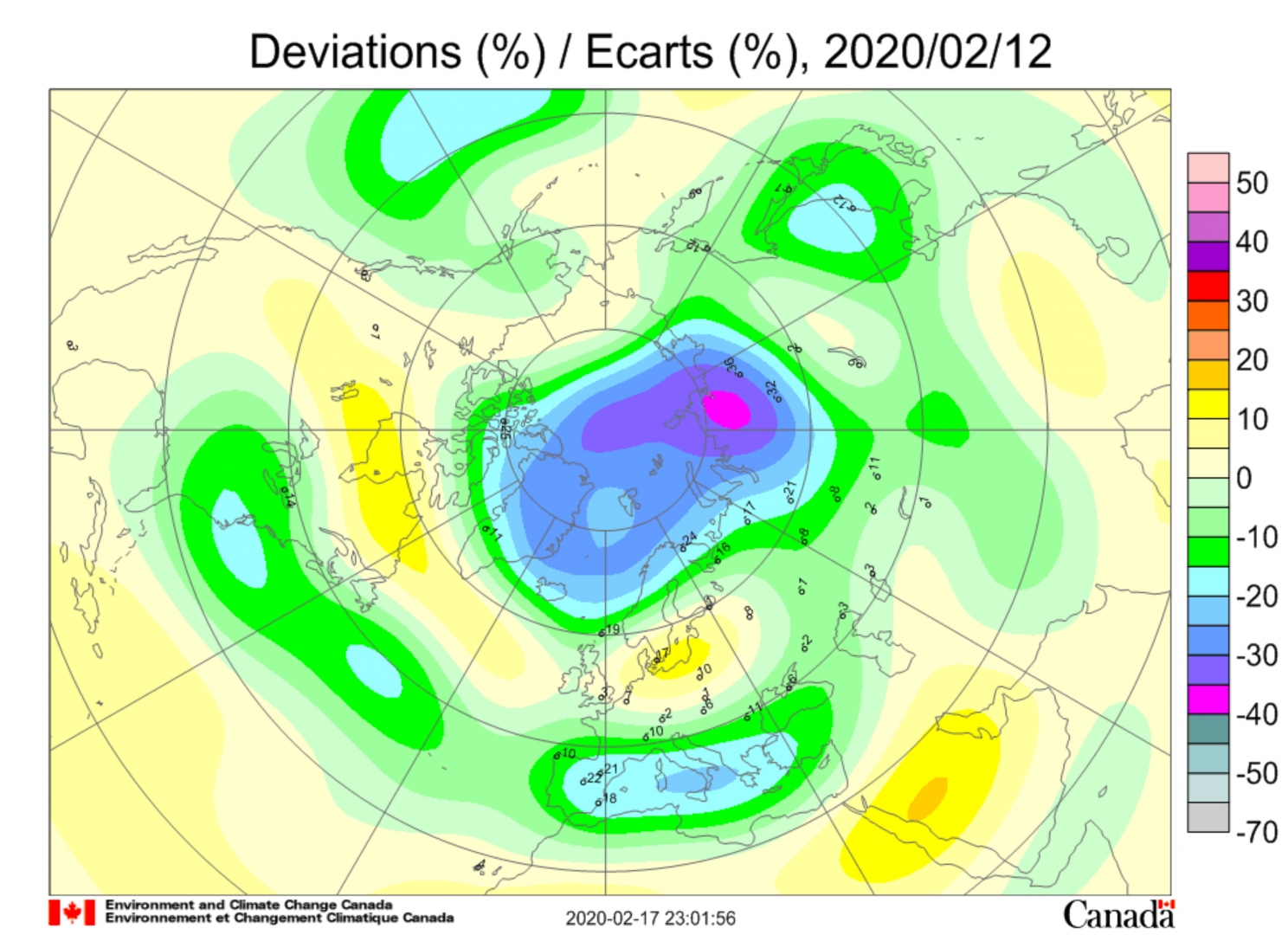 Рис. 19. Аномалия озона в атмосфере 12 февраля 2020 г. над очагом землетрясения магнитудой 4,0 на полуострове Таймыр. На острове Диксон отклонение температуры от нормы 13 февраля составило 22,4⁰