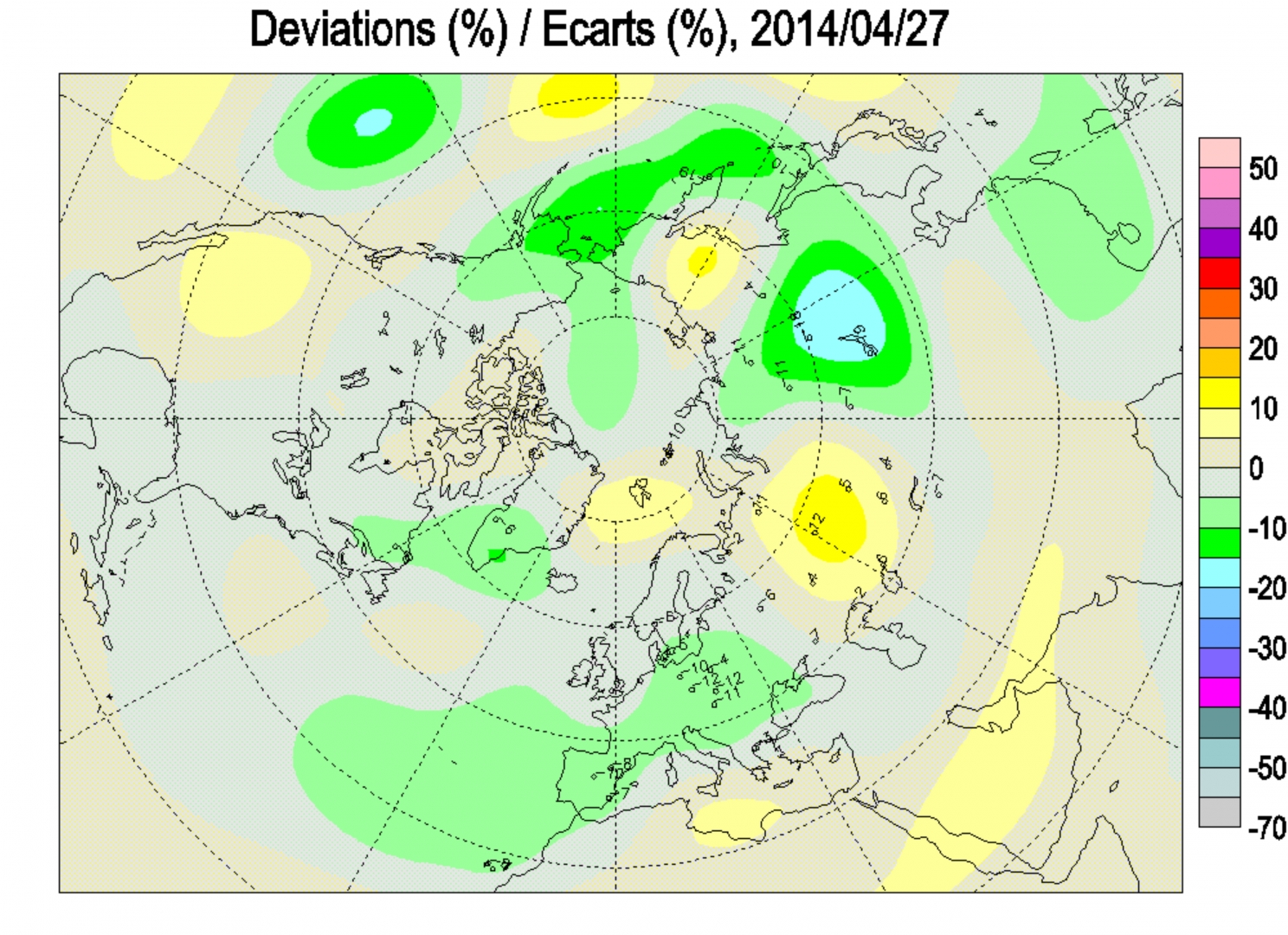 Рис. 24. Аномалия общего содержания озона 22 июля 2011 г. в районе Алеутской дуги. Через три дня температура воздуха на острове Адак достигла 12,2 °С