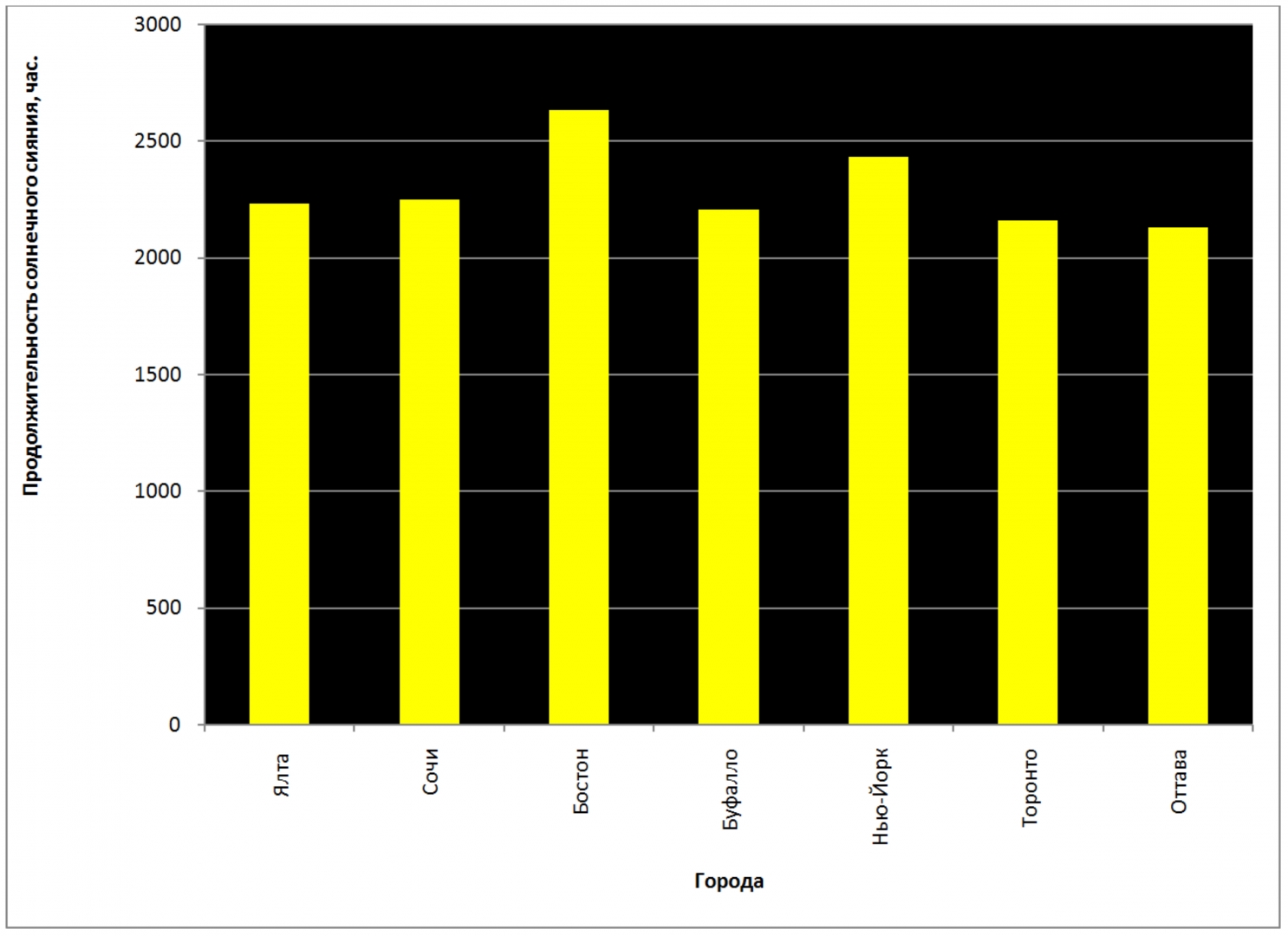 Рис. 31. Продолжительность солнечного сияния в городах России, США и Канады