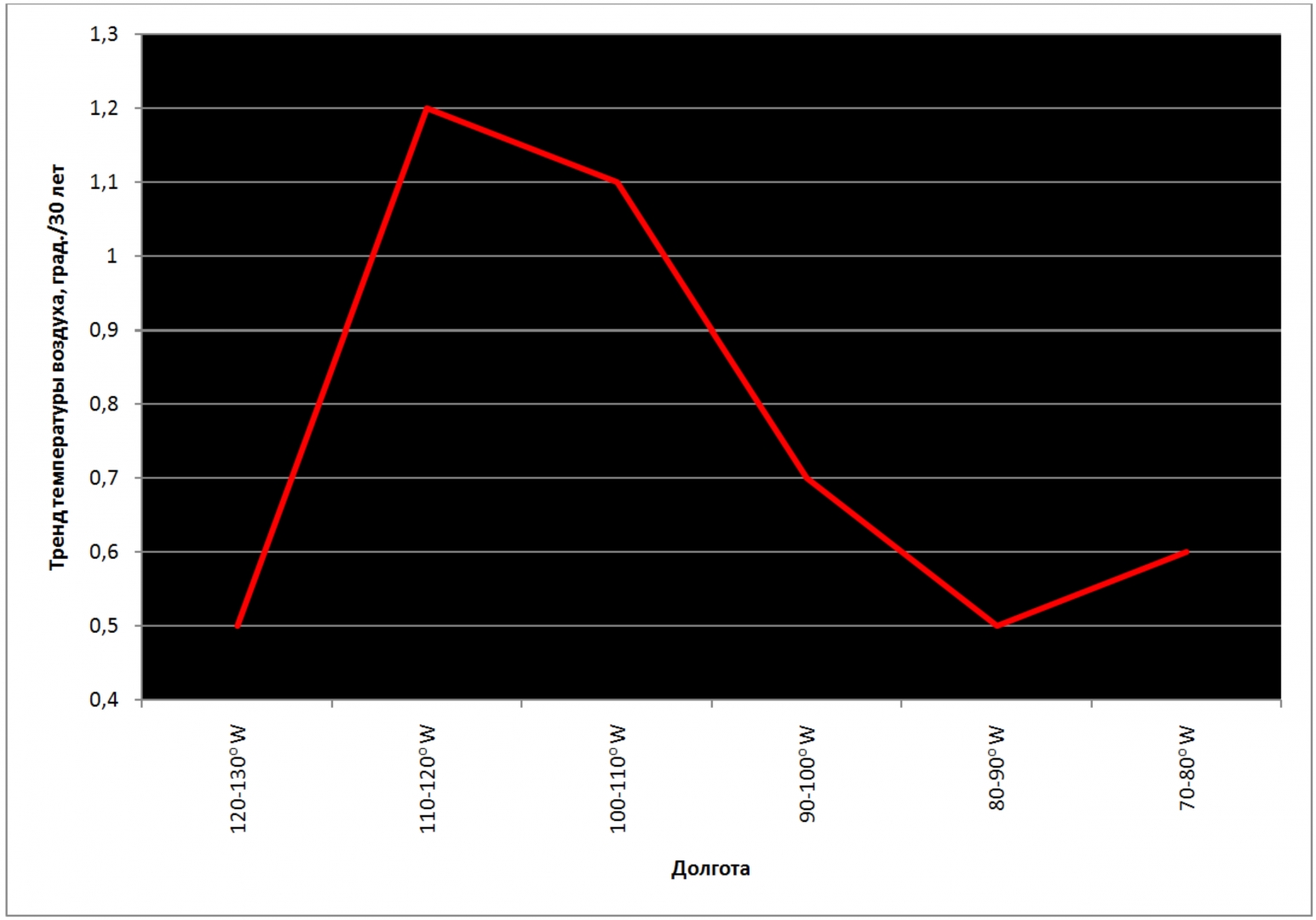 Рис. 6. Линейные тренды средней годовой температуры воздуха в 1990–2019 гг. по меридианам Северной Америки в широтном поясе 30–40° (к востоку от 100° з. д. в США находятся шесть из семи штатов с объемом эмиссии свыше 200 млн т СО2 в год)