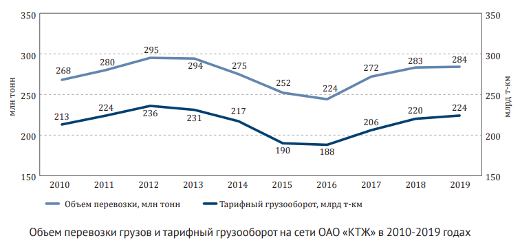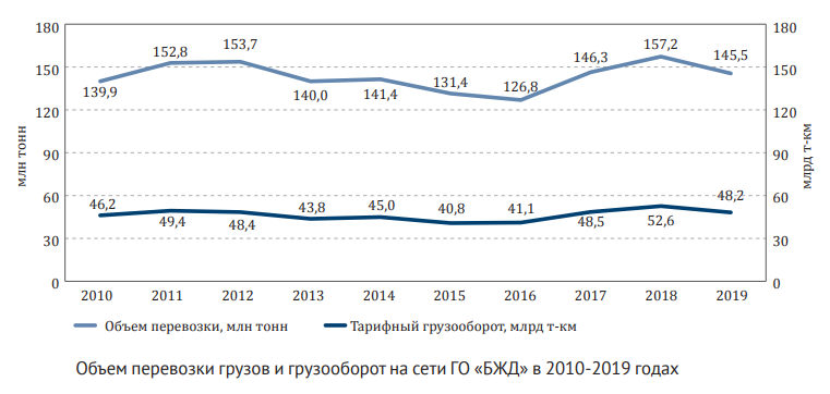 В 2010-2019 годах объем перевозки грузов на сети ОАО «РЖД» увеличился на 4,8% до 1 405,2 млн тонн.