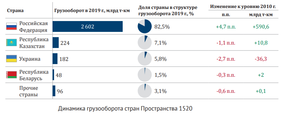 С 2010 по 2019 годы ключевой показатель, отражающий работу железнодорожного транспорта,– грузооборот– в странах Пространства 1520 увеличился на 22% до 3152 млрд т-км. Его динамика в рассматриваемый период была разнонаправленна, но в целом наблюдался тренд на увеличение. В частности, в 2010-2012 годах практически для всех стран Пространства 1520 было характерно увеличение грузооборота, что связано с восстановлением экономик после мирового экономического кризиса/