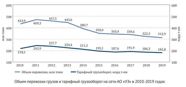 Грузооборот на сети АО «УЗ» в 2010-2019 годах демонстрировал снижение с 2012 года. За рассматриваемый период тарифный грузооборот сократился на 16,6% до 181,8 млрд т-км т в 2019 году.