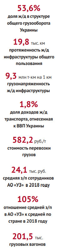 Железнодорожный транспорт является одним из крупнейших работодателей в Украине. В 2019 году списочная численность работников АО «УЗ» составила 256,6 тыс. человек, что на 25% ниже уровня 2010-го. Средняя заработная плата на ж/д транспорте в Украине при этом была меньше, чем средняя по Украине: в 2016 году она составляла 15,2 тыс. руб. (93% от средней заработной платы в стране), в 2017 году – 17,2 тыс. руб. (96%). К 2018 году компании удалось достичь уровня заработной платы выше, чем по стране – 24,1 тыс. руб. (105%).