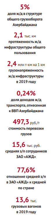 В 2010-2018 годах объем перевозок грузов ЗАО «АЖД» сократился на 37,2% до 14 млн тонн. Значительное снижение наблюдается после 2013 года, что связано с изменением структуры и направлений грузопотоков вследствие развития конкуренции с альтернативными видами транспорта. В структуре перевозки грузов доля железнодорожного транспорта сократилась с 11% в 2010 году до 6% в 2018 году. Объем перевозок во внутреннем сообщении с 2014 по 2018 годы сократился на 38%, транзит – на 32%. При этом с 2013 года сокращение транзита превысило 54%.