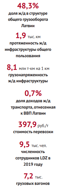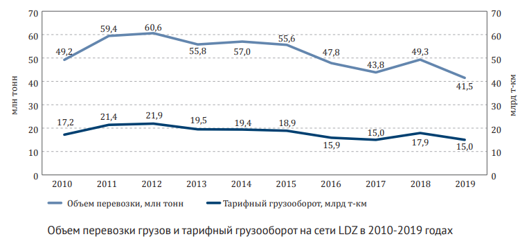 В 2010-2019 годах объем перевозки грузов на сети LDZ снизился на 15,6% до 41,5 млн тонн. При этом в 2010-2012 годах показатель вырос на 23,3% до 60,6 млн т, а с 2013 года стабильно снижается. Сокращение объема перевозки грузов железнодорожным транспортом обусловлено двумя тенденциями: переориентацией части грузоотправителей на порты других стран и растущей конкуренцией со стороны альтернативных видов транспорта. Например, с 2012 по 2016 годах грузооборот порта Вентспилса сократился практически в 1,6 раза до 18,8 млн тонн, что связано с вводом в эксплуатацию Балтийской трубопроводной системы и нефтетерминала в Приморске, а также в связи с принятым решением российской ПАО «Транснефть» отказаться от нефтетранзита через Прибалтику. На автомобильном транспорте с 2010 по 2019 годы объем перевозки увеличился на 57,6% до 73,8 млн т.