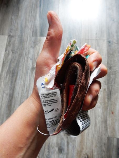 Для меня это и есть так называемый "ноль отходов", но какой-то мусор всё равно неизбежен, увы( Давайте я расскажу вам про него. Итак, я прилетела домой в Екб 10 августа, после перелёта у меня остался посадочный талон, багажная квитанция и лента, которую клеят на багаж (это особый вид бумаги с клеевым слоем, к тому же на вощёном основании — такое нельзя сдать в переработку, это не макулатура!). У нас несколько дней подряд были затяжные дожди — мои стельки размокли и превратились в кашу(( Хорошо, что это просто спрессованный картон)) Так же у меня осталось несколько "пушистиков" после расчесывания волос, промасленная этикетка от подсолнечного масла (а саму бутылку я вымыла и сдала на переработку), а также термоусадочная плёнка от минеральной воды и соуса (эти плёнки, увы не принимают на переработку, но саму ПЭТ-бутылку, стеклянную бутылку и крышки от них я сдала в переработку)).