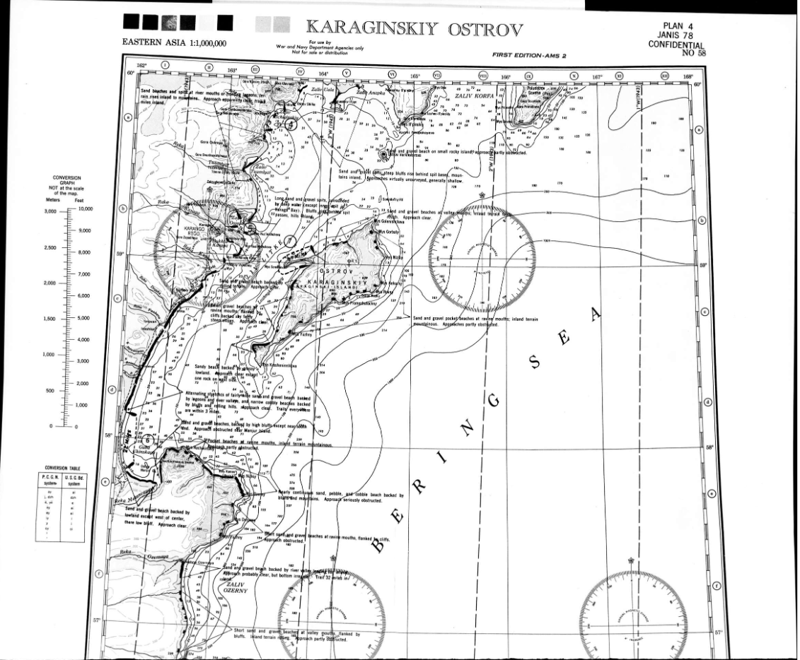 Обозначение на картах мест высадки с описанием наиболее удобных зон высадки с тяжёлым вооружением говорит о готовившейся во время ВМВ силами англосаксов и их союзников операции отторжения у СССР островных территорий на Дальнем Востоке и полуострова Камчатка.