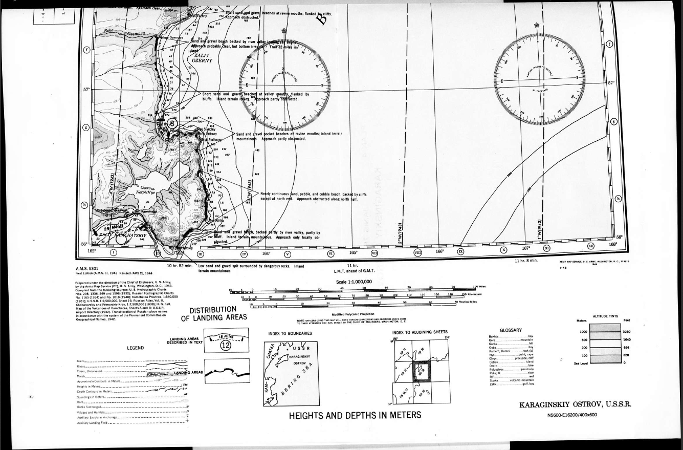 В 1944-45 годах ещё до капитуляции Германии, объявления войны Японии Советским Союзом, США имели планы повторить отторжение ВСЕГО островного Дальнего Востока СССР с полуостровом Камчаткой. Немного карт, в частности остров Карагинский, показаны зоны высадки как на остров Карагинский, так и на полуостров Камчатка. Стоит отметить что лет 10 назад - точнее не вспомню были работы по тихоокеанскому побережью Камчатки по прецизионному наблюдению "за живностью", если говорить своими словами - составление высокоточных карт мелководных, до десятков метров, обычно до 25-45м, участков вдоль побережья Камчатки, возможно и островов, применялся лидар на небольшом транспортно-пассажирском самолёте. Наличие подобных данных позволяет получить данные которые ни на то время ни во многом сейчас недоступны для спутниковой разведки и могут применяться для удара дронами амфибийного типа или с АНПА ракетами/дронами по объектам инфраструктуры и военным объектам с целью захвата данной территории Русского сектора. То что их же агенты делали много для уничтожения русских им было явно мало. Я видел также середины 1950-х годов карты с нанесёнными эпицентрами бомбардировки Ленинграда. Кроме как прямой угрозы нужным популяциям людей а среди русских с половину земной, я расценивать данные действия не могу. США недавно отрабатывало ССО с С-130 и Оспри работу по объектам в Эстонии, тут 12 минут лёту до Невы. Видимо пока сами не будут усиленную дефекацию иметь то так и будут дёргать смерть за балахон.