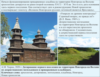 Аннотация. На территории Новгорода на Волхове и в его окрестностях археологи не обнаружили дохристианские могильники. Начало функционирования прицерковных кладбищ ими датируется не ранее второй половины XV в. Но достоверность этого хронологического рубежа вызывает сомнение. Он гарантированно находится в XVI в. Это и есть дата основания здесь поселения – вторая половина XV(?) – XVI вв. Она соответствует реконструкциям Новой хронологии и подтверждает гипотезу «Великим Новгородом русских летописей является Ярославль».