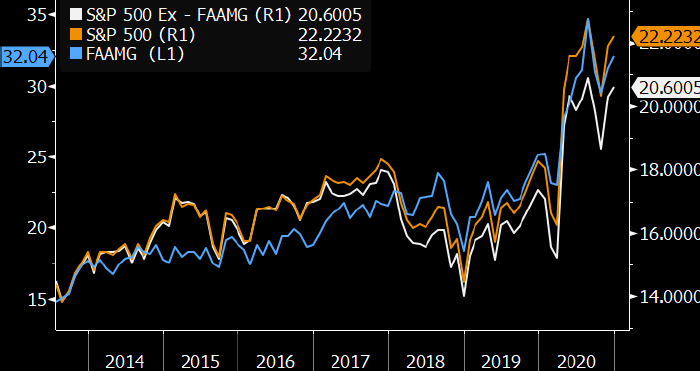 Заглавная кликабельная картинка выглядит вроде бы наименее информативно. Но она очень точно отражает настроения 2020 года. Это уровень вкладов в ETF. Розничный бытовой инвестор просто не знает - в какие акции вложиться и несёт свои деньги в индексные фонды. По этому году уровень достиг 30 трлн долларов! Очень опасная тенденция. Суть простая - люди отказываются от самостоятельной оценки рисков и перспектив каких-либо отдельных компаний. Индексный фонд сам покупает акции по их доле ("весу") в том или ином индексе - СиПи, НАСДАК или каком другом. Бумаги покупаются все подряд - и "мусорные", и нормальные - что ведёт к росту индексов. Чем больше принесут - тем больше вырастут индексы. Чем больше они растут - тем охотнее несут новые деньги. Самоподдерживающая дорога в тупик. Но это вполне работает. Ну или должно работать) В этом году пандемия больше всего топталась по США - но их же рынок и вырос сильно выше среднемировых темпов. А вот что происходит в локомотиве СиПи - пятёрке ФААМГ.