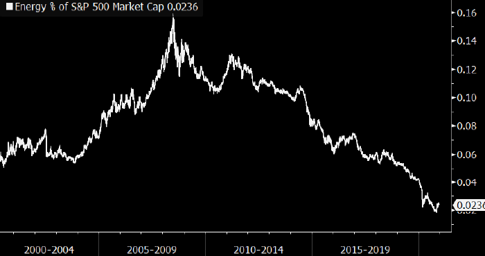 Хотя в целом - познавательно. По поводу перспектив энергорынка США - включая углеводороды, на которых он и держался - вот доля компаний этой сферы в индексе СиПи.