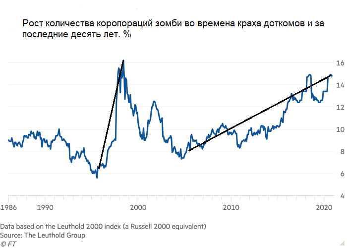 Инвесторы и аналитики, предупредили, что сейчас отчетливо стала наблюдаться одна из наиболее тревожных тенденций на рынках корпоративного долга и корпорации закрывают годовые балансы в гораздо более рискованном состоянии. Американские компании заняли на рынке облигаций рекордные $ 2,5 трлн в 2020 году. Из-за разгула заимствований леверидж - коэффициент, измеряющий долг по сравнению с прибылью - достиг рекордного уровня для компаний с высокими рейтингами. Разрыв между долгом и прибылью уже превзошел исторический рекорд на конец 2019 года. В то же время способность компаний платить за увеличение долга снизилась, а количество так называемых зомби-компаний, чьи процентные выплаты превышают прибыль в течение трех лет подряд, приближается к историческому пику.