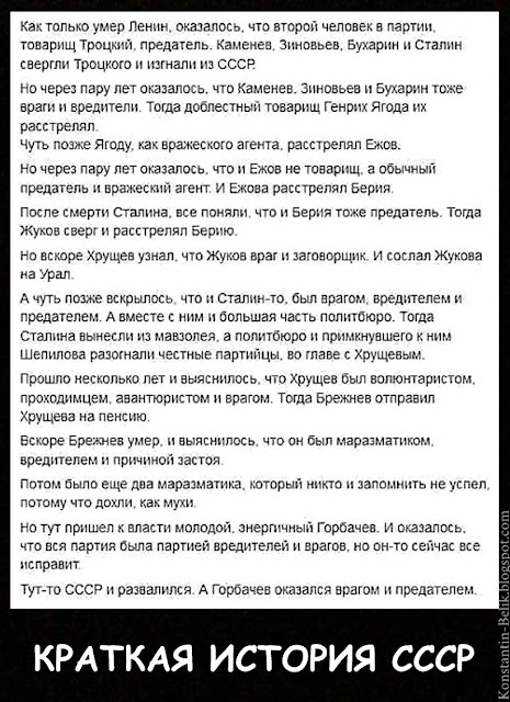 «Ты лучше расскажи ,как коммунисты имевшие в СССР абсолютную власть - политическую, экономическую, военную, идеологическую и т.д. умудрились просрать этот самый СССР и расчленить его на 15 частей, три из которых вступили против нас в НАТО, одна затеяла с нами войнушку, и ещё одна всеми силами стремится втянуть нас в войну? Притом, что в СССР кроме коммунистов не было ни либералов, ни демократов, никого!!!» © VseDoFeNi