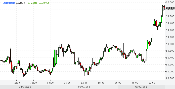 Уже под 92 подобрался. Вернуться в район 89,5 - это будет, по всей видимости, дело первой декады января. Нефть Брент сейчас около 3850 рублей за бочку и до 3600 - это запас, на котором можно укреплять российскую валюту без проблем. Ну и "опоздунов", которые затянули с уплатой налогов побреют по цене 3850 и торг здесь не уместен. В общем, не нужно забывать, что 2021-й - это по китайскому календарю год Быка и прямо-таки биржевой год. Ведь на торгах "быками" называют тех, кто играет на повышение и рост. В общем, будет интересно. А для России - ещё и замечательно!