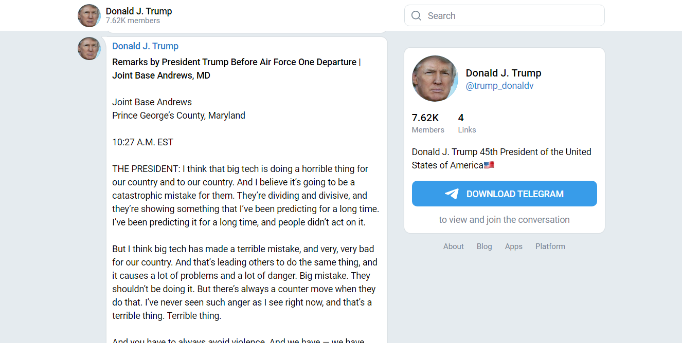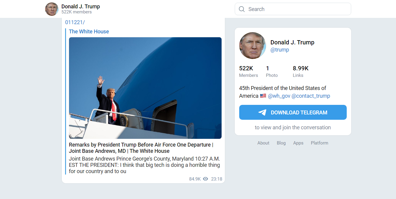 Трампы в Telegram зашевелились... 0.2K 01:52 - 13/Янв/21 ofelias (7 лет 1 месяц) @trump@trump_donaldv Авторство: Авторская работа / переводикаИспользованные источники: @trump@trump_donaldv