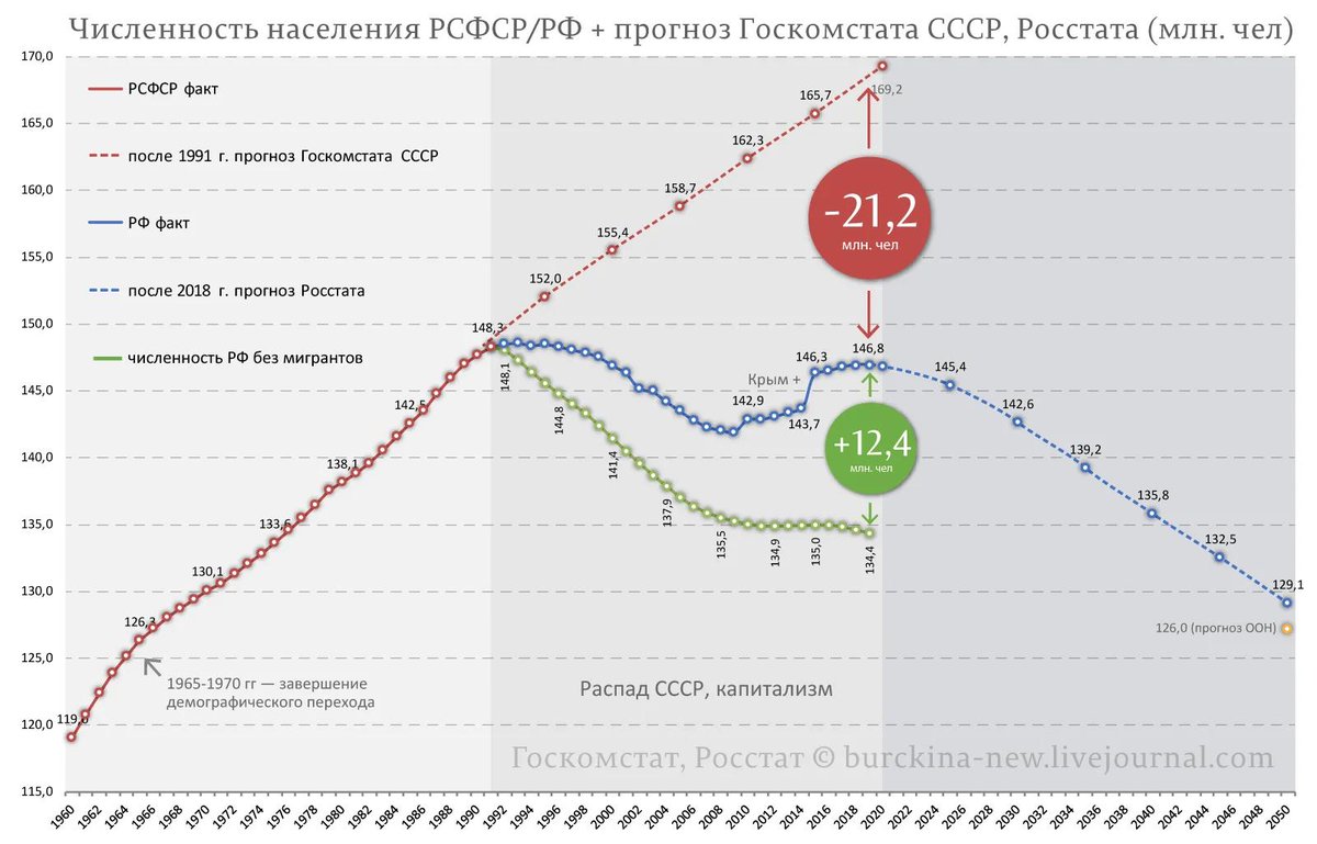 То есть ситуация была такой-же, только более жёсткой по озвученным выше причинам. Из-за изначально низкой и снижающейся в СССР рождаемости (не потому, что Сталин всех детей съел, а потому, что урбанизация повышение уровня жизни), население не смогло восполниться и даже выйти в естественный прирост до того, как закончилась демографическая яма. А выход на прирост был, несмотря на ужасный капитализм, только вот прирост продлился недолго из-за начала новой фазы демографической ямы.