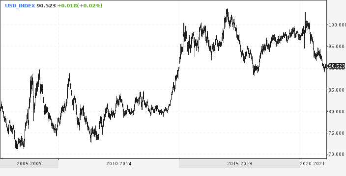 Все графики буду давать с небольшим запасом - чтобы наглядно было видно ситуацию до, во время и по наши дни. Сначала про причины и следствия. Во главе ФРС тогда ещё был Бен Бернанке, который неосмотрительно заявил, что рано или поздно подкачку от печатного станка нужно будет прекращать и экономика должна оздоравливаться и научиться жить без этих постоянных подпыров. В целом - вроде бы совершенно очевидная вещь, всем и без того понятная. Но рынки это восприняли как сигнал. Ну практически на уровне - QE вот уже чуть не завтра всё и пора валить. И спекули ломанулись из всего в кэш. Логично, что индекс силы доллара ломанулся вверх. Выглядело это так: