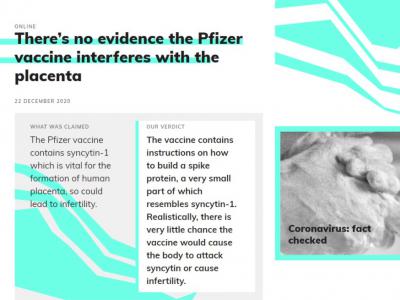Было предположено, что вакцины COVID-19 вызовут бесплодие из-за очень короткой аминокислотной последовательности в спайковом белке SARS-CoV-2, который частично разделяется с белком в плаценте, называемым синцитин-1. С научной точки зрения различия между этими двумя последовательностями весьма значительны, что делает весьма маловероятным, что наша вакцина может вызвать ответ, который повредит плаценте.