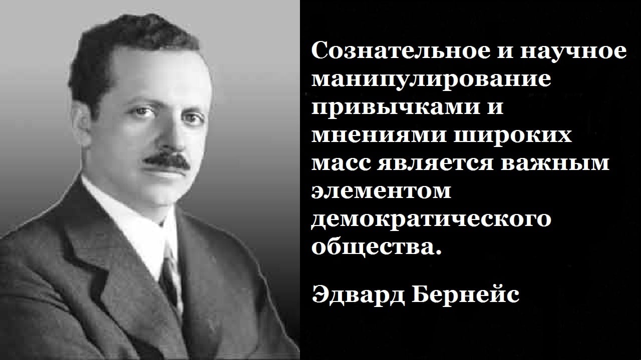 "Сознательное и умелое манипулирование упорядоченными привычками и вкусами масс является важной составляющей демократического общества. Приводит в движение этот невидимый общественный механизм невидимое правительство, которое является истинной правящей силой в нашей стране.