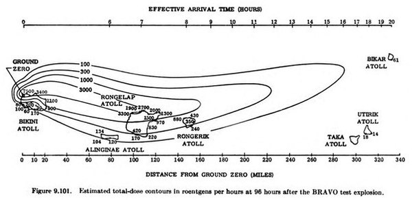 Уже через 15 минут после взрыва люди, находившиеся в бункере на Бикини, зарегистрировали сильную радиоактивность — 40 рентген в час. Их смогли вывести из бункера лишь спустя 11 часов. Через 5 часов после взрыва корабли, находившиеся в 30 милях (55,5 км) от атолла, также подверглись заражению уровня примерно 5 рентген в час, что вынудило их экипажи укрываться во внутренних помещениях. Рыба была отравлена, от радиации умерло много людей. За считанные часы белым хлопьеобразным пеплом были покрыты острова атоллов Ронгелап и Айлингинае. Несколькими часами позже американские метеорологи зафиксировали сильный снегопад в районе Ронгерика, в то время как жители острова Утрик и еще нескольких островов наблюдали странный снегообразный туман.