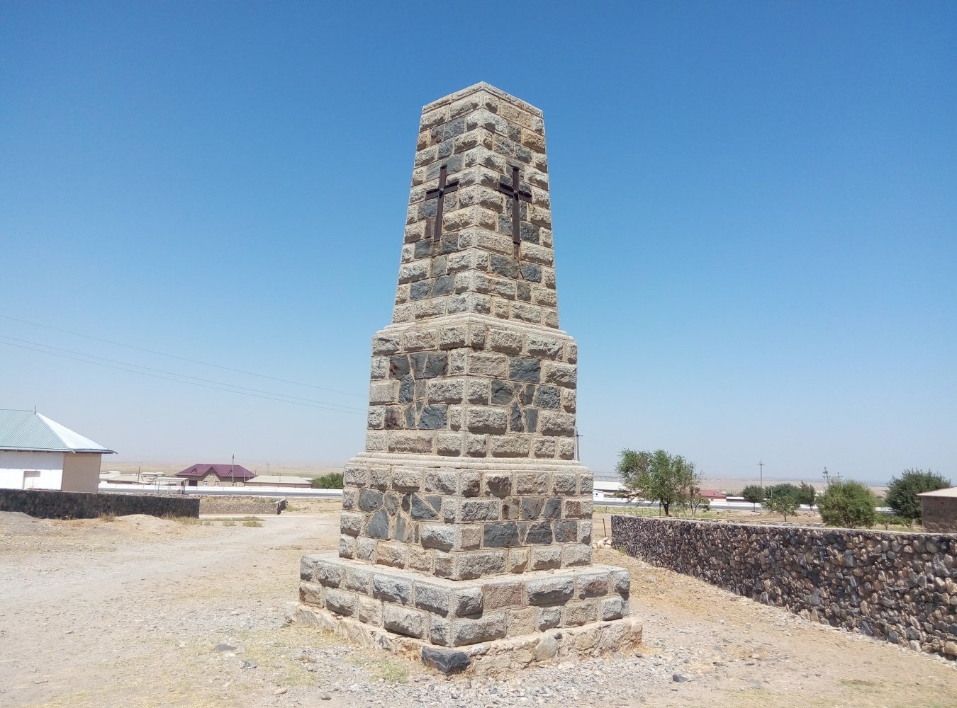 В нескольких километрах от него находятся большой кишлак Сарыкуль и селение Джам. Неоднократно проезжая через них, я всегда обращал внимание на установленную рядом с дорогой большую каменную пирамидку с крестом на ней.