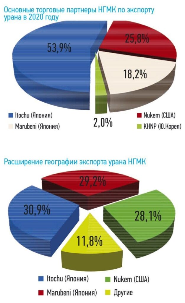 До 2007 года природный уран, производимый Навоийским ГМК Узбекистана, реализовывался компании Nukem, Inc. (США), которая имела эксклюзивные права на приобретение урана. После проведения соответствующих работ по диверсификации рынка и покупателей продукции с 2007 года уран стал реализовываться японской корпорации Itochu и с 2008 года – китайской компании CGNPC. На сегодняшний день основными торговыми партнерами НГМК по экспорту урана являются корпорации Itochu и Marubeni (Япония), компания Nukem, Inc. (США).