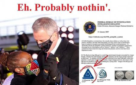 Однако периодически появляются публикации, подобные этой, которые вызывают немалое количество вопросов. Могут ли Билл де Блазио и Ширлин Маккрей быть участниками той самой схемы сексуальной эксплуатации маленьких детей, описанной "Q"? Была ли маска со знаками педофилов надета случайно? А если нет? Какая тогда была цель? Демонстрация своих сексуальных предпочтений? Поиска тех, чьи вкусы совпадают со вкусами Нью-Йоркской четы? Обмен опытом? Детьми?