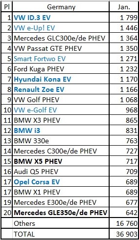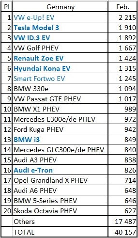 Февральские продажи составили 40 157 электромобилей (+143% г/г), просто фантастический, более чем 2-х кратный рост по сравнению с соответствующим месяцем прошлого года (16 508 единиц)! Тенденция не изменилась, продажи плагинов растут опережающими темпами - (+ 124% для BEV и + 162% г/г для PHEV). Глядя на бестселлеры прошлого месяца, в феврале у нас был неожиданный победитель: крошечный VW e-Up превзошел обычных лидеров, зарегистрировав 2215 проданных единиц.