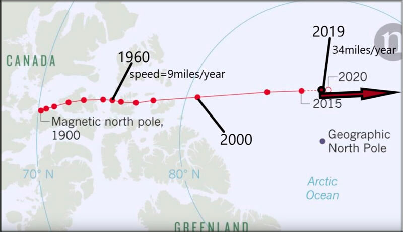 /////// Есть мнение, что увеличение скорости магнитного полюса является предвестником переполюсовки Земли или кувырка. Если кувырок будет происходить в направлении движения магнитного полюса в сторону России, то первичная инерционная километровая волна из северного ледовитого океана накроет Канаду и США. //////