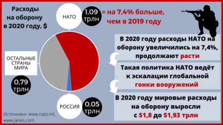 По подсчетам нашего МИД, военные расходы НАТО резко возросли в прошлом году - на 7,4% - и составили чуть больше одного триллиона долларов. Для сравнения, расходы России составляют примерно 0,05 трлн. И поскольку военный альянс изначально появился ради противостояния СССР, а теперь - России, то сравнивать их расходы вполне уместно.