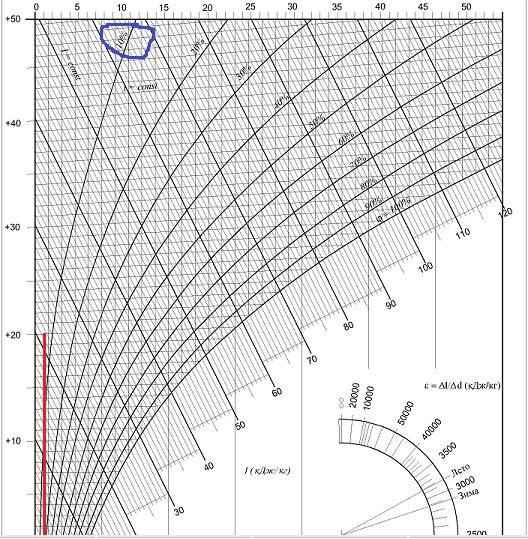 Берем температуру минус 20, относительную влажность ну хрен с ним 70-80% и тянем строго вверх линию до + 20 градусов Цельсия. На рисунке красным