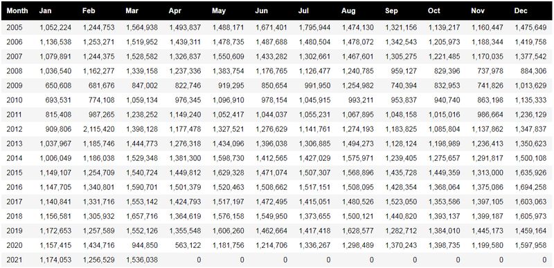 Судя по всему, проблемы в экономике вылились в падающий тренд с сентября 2019 года. И COVID-19 подвернулся очень вовремя. Итоги первого квартала 2021 года наиболее близки к аналогичному периоду 2019 года и в текущей ситуации не дают оснований для оптимистичного прогноза. Следует учитывать, что с 2005 по 2020 год население США выросло с 295 до 330 млн. человек (почти на 12 %), поэтому стагнация показателей означает реальное падение покупательного спроса.
