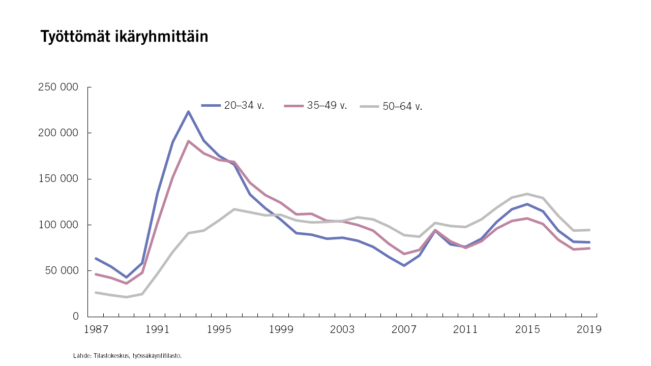 “Взросление безработных связано с демографической ситуацией и критическими изменениями требований на рынке труда. В Финляндии исчезают рабочие места, не требующие квалификации. Если в 1987 году на рабочем рынке было занято 450 000 мужчин и 420 000 женщин без образования, то сейчас этот показатель составляет 160 000 мужчин и 80 000 женщин. То есть число неквалифицированных работников уменьшилось на 630 000 человек”, – пишет Пююккёнен.