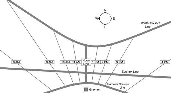 В течение года тень двигается от точки летнего солнцестояния через равноденствие к точке зимнего солнцестояния и обратно.